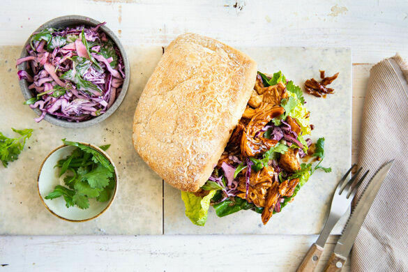 Die Brötchen aufschneiden und nach Geschmack mit den Salatblättern, dem Rotkohlsalat und dem Pulled Chicken belegen. Mit dem restlichen Koriander garnieren und mit dem restlichen Rotkohlsalat servieren.