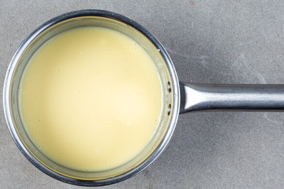 Die Crème fraîche und 1 kleine Prise Salz in die geschmolzene Schokolade rühren, bis eine glatte Creme entsteht. Den Topf vom Herd nehmen.