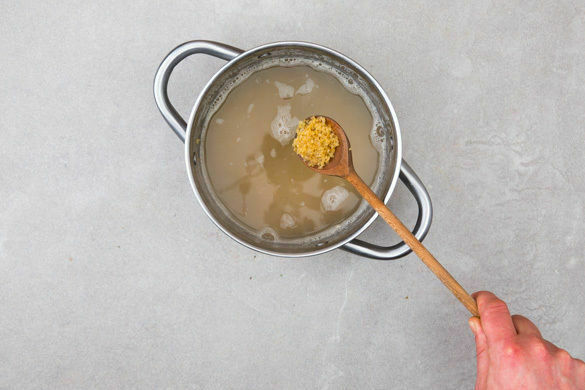 In einem mittelgroßen Topf ca. 1,4L gesalzenes Wasser zum Kochen bringen. Sobald das Wasser kocht, den Bulgur hinzufügen und abgedeckt bei mittlerer Hitze 8–10Min. köcheln lassen. Den Bulgur in ein Sieb abgießen und abtropfen lassen.