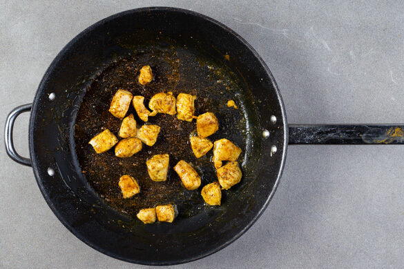 Das Fleisch trocken tupfen, in mundgerechte Würfel schneiden und in einer großen Pfanne mit 1EL Olivenöl, 1TL Currypulver und 1 kräftigen Prise Salz bei mittlerer bis starker Hitze ca. 3Min. rundum scharf anbraten. Das Fleisch soll noch nicht durchgaren. Auf einem Teller beiseitestellen.