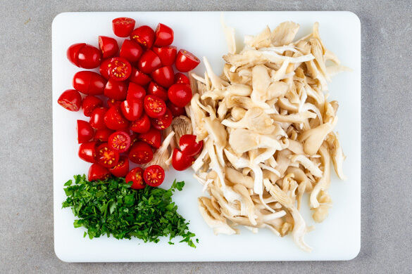 In einem großen Topf ausreichend gesalzenes Wasser für die Pasta zum Kochen bringen. Die Austernpilze in dünne Streifen schneiden. Die Kirschtomaten halbieren. Die Petersilie samt Stängeln fein hacken.