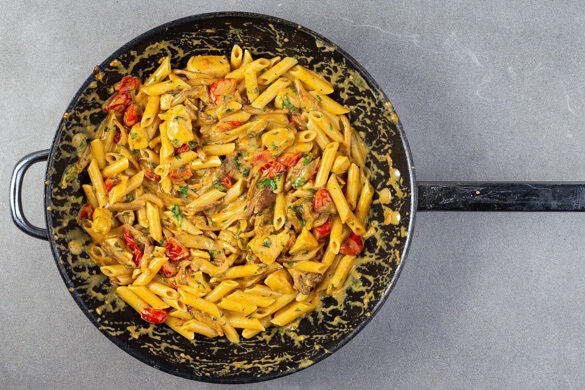 Das ist mal wieder ein wirklicher Wohlfühlangriff an allen Fronten: Dieses leckere Pastagericht geht nicht nur schnell, es hat auch alles, was das Herz begehrt! Als wäre zartes Hähnchen mit Currynote in cremiger Sauce nicht schon genug, verfeinerst du den kulinarischen Traum auch noch mit Petersilie und Kirschtomaten. Der besondere Gast des Abends: mild-aromatische Austernpilze. Und schon sind alle wunschlos glücklich ...