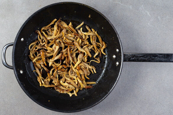 Die Pilze in derselben Pfanne mit 1/2TL Salz bei mittlerer bis starker Hitze ca. 5Min. goldbraun anbraten.