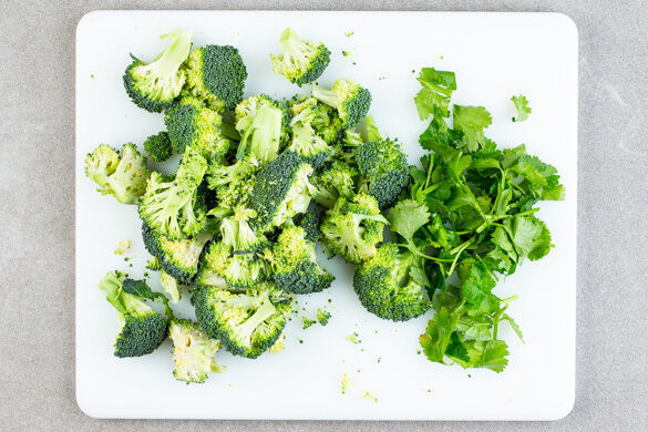In einem mittelgroßen Topf ausreichend leicht gesalzenes Wasser für den Brokkoli zum Kochen bringen. Den Brokkoli in mundgerechte Röschen schneiden. Den Koriander samt Stängeln grob schneiden.