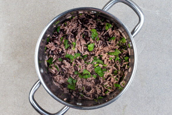 Den Backofen auf 240°C (220°C Umluft) vorheizen. In einem mittelgroßen Topf die Kokosmilch mit 300ml Wasser zum Kochen bringen. Den Reis in einem Sieb unter fließendem Wasser abspülen, bis das Wasser klar bleibt, dann mit den Bohnen samt Flüssigkeit in die kochende Flüssigkeit geben und abgedeckt bei niedrigster Hitze 12–14Min. garen. Noch ca. 5Min. ohne Hitzezufuhr ziehen lassen.