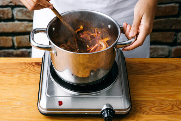 Die Zwiebeln in einem mittelgroßen Topf mit 1EL Pflanzenöl und der 1/2 der Currypaste bei mittlerer Hitze 1–2Min. anbraten. Tipp: Wer mag, kann auch mehr Currypaste verwenden.
