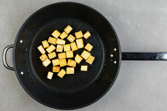 Die Tofuwürfel in einer großen Pfanne mit 3EL Pflanzenöl bei mittlerer Hitze ca. 5Min. anbraten, dabei nicht bewegen. Die Tofuwürfel dann wenden und jede weitere Seite ca. 2Min. anbraten, bis der Tofu goldbraun ist. Den Tofu auf einem Teller beiseitestellen, die Pfanne aufbewahren.