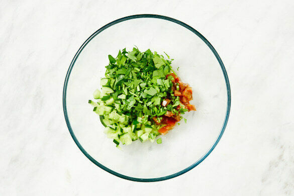 Die Gurke in kleine Würfel schneiden. Die Tomaten ebenfalls in kleine Würfel schneiden. Den Knoblauch schälen und fein würfeln. Die Petersilie samt Stängeln fein hacken. Die Zitronenschale fein abreiben, dann die Zitrone halbieren und auspressen.