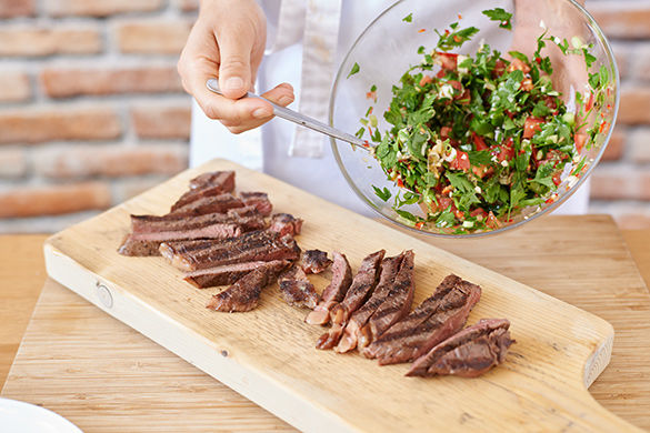 Das Fleisch in Tranchen schneiden und mit der Salsa anrichten. Die Kartoffeln mit Salz und Pfeffer abschmecken und mit den Steakstreifen und Chimichurri servieren.