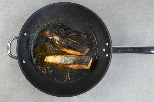 Den Lachs mit kaltem Wasser abspülen und trocken tupfen. Evtl. vorhandene Gräten mit einer Pinzette entfernen. Mit der Gewürzmischung einreiben und leicht salzen, dann in einer großen Pfanne mit 2EL Olivenöl auf der Hautseite 2–3Min. kross anbraten. Den Fisch wenden, mit dem Limettensaft ablöschen und noch 3–4Min. braten, bis der Fisch gar ist.