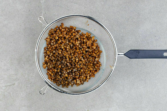 Die Linsen in einem Sieb mit kaltem Wasser abspülen und abtropfen lassen.