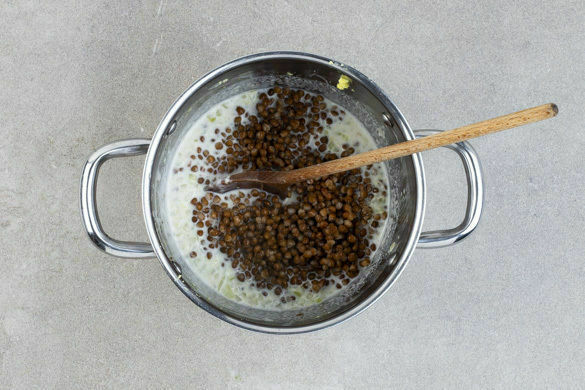 Die Zwiebeln in einem mittelgroßen Topf mit 1EL Olivenöl bei mittlerer Hitze 1–2Min. anschwitzen. Den Knoblauch und den Ingwer dazugeben, dann mit ca. 2/3 der Kokosmilch ablöschen und diese 2–3Min. einköcheln lassen. Die Linsen dazugeben, 2–3Min. mitköcheln lassen und mit Salz und Pfeffer würzen. Tipp: Wer mag, kann auch mehr Kokosmilch verwenden.