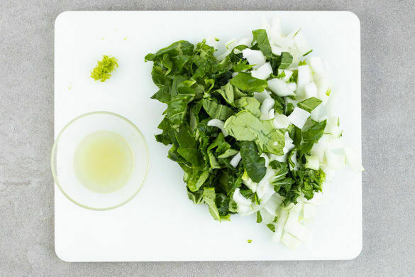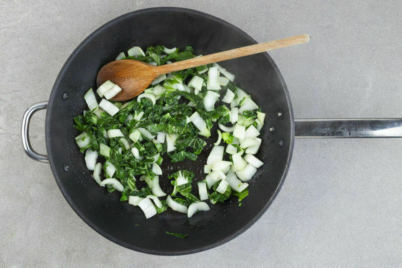 Die Limettenschale abreiben, dann die Limette halbieren und auspressen. Den Pak Choi in ca. 1cm breite Streifen schneiden.