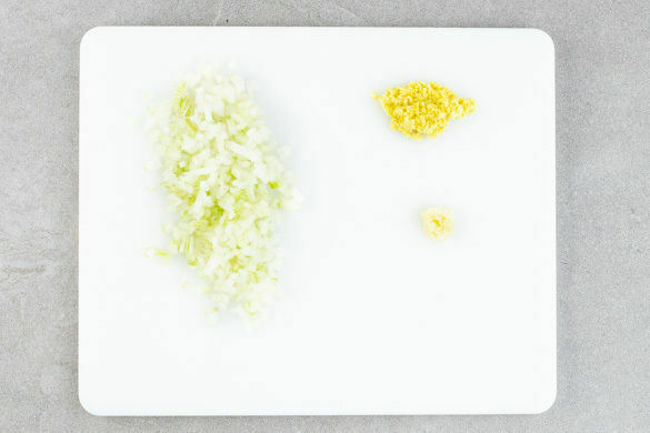 Die Zwiebel und den Knoblauch schälen und in feine Würfel schneiden. Den Ingwer schälen und fein reiben.