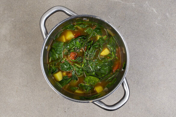 Die Zwiebeln in einem großen Topf mit 1EL Olivenöl und der 1/2 der Gewürzmischung bei mittlerer Hitze 2–3Min. anbraten. Die Kartoffeln, die groben Tomatenwürfel, das Brühgewürz und 1L heißes Wasser zugeben. Den Spinat unterrühren, die Suppe zum Kochen bringen und abgedeckt ca. 10Min. bei mittlerer bis niedriger Hitze köcheln, bis die Kartoffeln gar sind.