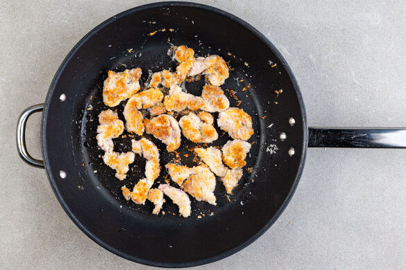 Inzwischen das Fleisch in einer großen Pfanne mit 2EL Pflanzenöl bei mittlerer Hitze 3–4min. rundum knusprig anbraten. Anschließend auf einem Teller abgedeckt beiseitestellen.