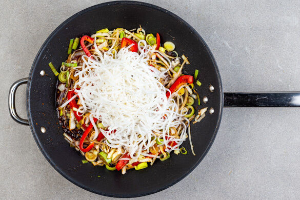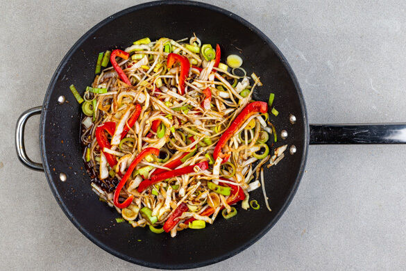 Den Gemüsemix in derselben Pfanne mit 1EL Pflanzenöl bei mittlerer bis starker Hitze ca. 2Min. anbraten. Mit 100ml Wasser, der Bohnensauce, der Sojasauce und 1EL Essig ablöschen und das Gemüse noch ca. 1Min. garen. Es soll noch etwas knackig sein.