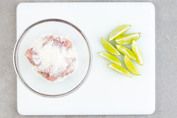 Das Fleisch mit 4–5 Prisen Salz sowie Pfeffer nach Geschmack würzen und mit den Kokosraspeln vermengen. Die Limette in Spalten schneiden.