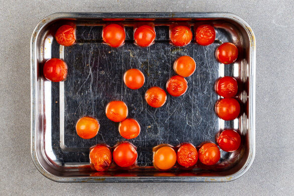 Die Kirschtomaten in eine kleine Auflaufform geben. Im Ofen 8–10Min. garen, bis sie zu platzen beginnen.
