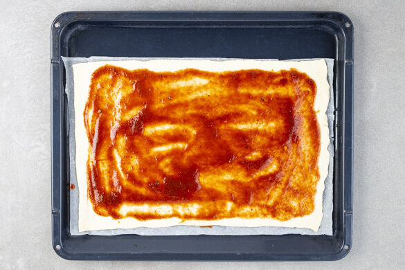 Inzwischen den Teig mit dem Papier nach unten auf einem Backblech ausrollen und mit den passierten Tomaten bestreichen. Mit Salz und Pfeffer würzen.