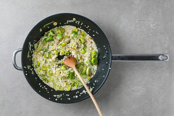 Den Lauch in einer großen Pfanne mit 1EL Olivenöl bei mittlerer Hitze 2–3Min. anbraten. Den Knoblauch und den Reis zugeben und ca. 1Min. mitbraten, dann nach und nach mit der Brühe ablöschen und stetig rühren, damit der Reis nicht ansetzt. Diesen Vorgang 18–20Min. lang wiederholen, bis die Brühe aufgebraucht und der Reis bissfest ist.