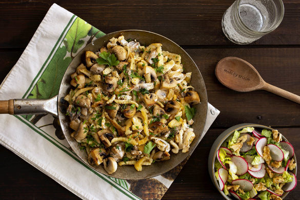 Das Panko-Paniermehl und die Haselnüsse in einer kleinen Pfanne mit 1–2EL Pflanzenöl bei mittlerer Hitze 2–3Min. goldbraun anrösten. Die Pilzspätzle mit den Nussbröseln und der restlichen Petersilie garnieren und mit dem Radieschensalat servieren.