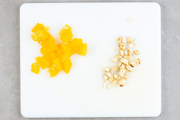 Die Orangenschale so herunterschneiden, dass die weiße Haut vollständig vom Fruchtfleisch entfernt wird. Das Fruchtfleisch in Stückchen schneiden und mit der 1/2 des Dressings unter den Salat mengen. Die übrigen gerösteten Cashews hacken. Den Salat mit dem Tofu, dem restlichen Dressing, den Cashews und dem übrigen Koriander anrichten und servieren.