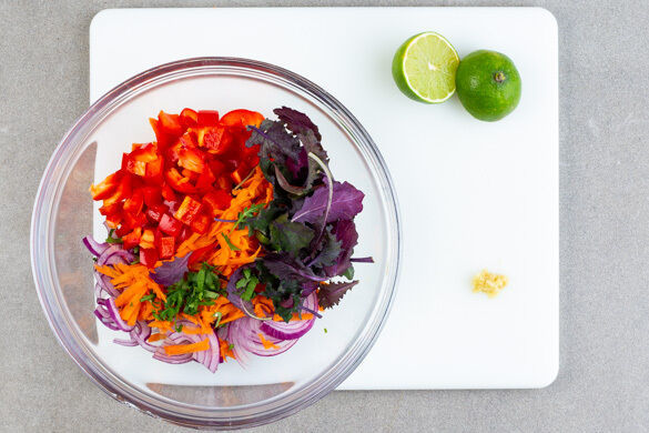 Die Paprika halbieren, entkernen und in dünne Streifen schneiden. Mit den Karottenraspeln, den Zwiebeln und dem Mizuna-Salat vermengen. Die Korianderblätter von den Stängeln zupfen, die 1/2 der Blätter fein schneiden und ebenfalls untermischen, die Korianderstiele aufbewahren. Die Limette halbieren und auspressen. Den Ingwer schälen und fein reiben.