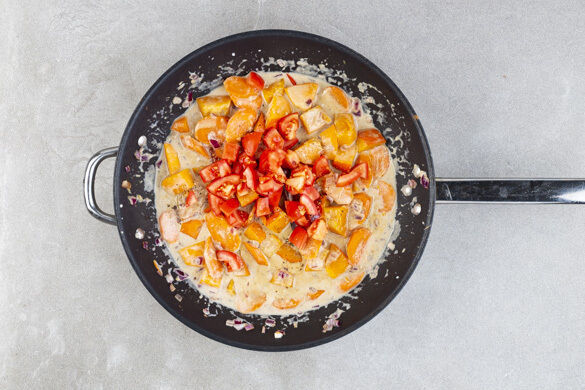 Die Tomaten in kleine Würfel schneiden und in den letzten 2Min. zum Curry hinzufügen. Das Curry nach Geschmack mit Salz und Pfeffer würzen und mit dem Reis und dem Chutney servieren. Den restlichen Koriander grob zerreißen und darüberstreuen. Tipp: Das Chutney mit dem Reis und dem Curry verrühren, damit sich das Aroma entfalten kann.