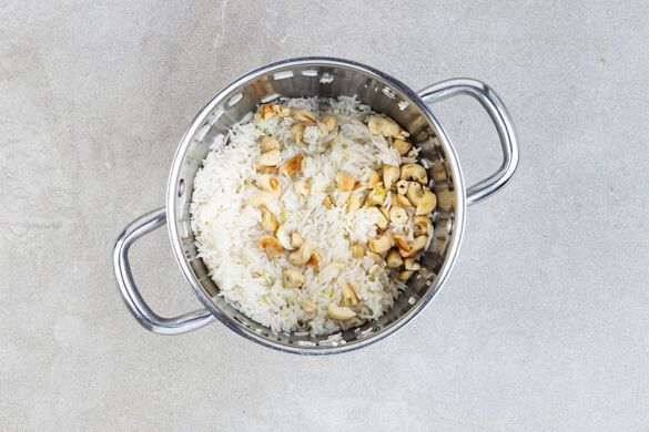 Den Reis in einem Sieb unter fließendem Wasser abspülen, bis das Wasser klar bleibt, dann in das kochende Wasser geben und abgedeckt bei niedrigster Hitze 10–12Min. kochen, bis das Wasser aufgesogen und der Reis gar ist. Noch ca. 5Min. ohne Hitzezufuhr ziehen lassen. Die Cashews grob hacken. Die Zitronenschale abreiben, dann die Zitrone halbieren und auspressen.