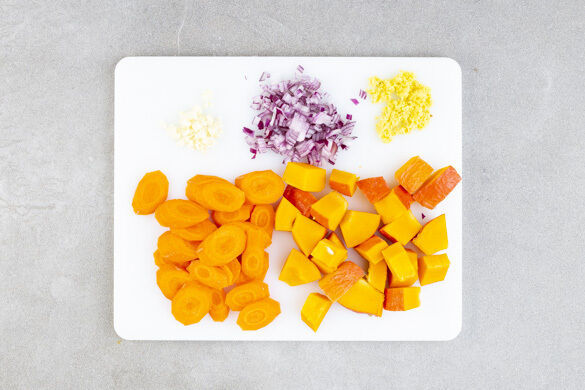 In einem kleinen Topf 400ml leicht gesalzenes Wasser für den Reis zum Kochen bringen. Den Kürbis halbieren, die Kerne entfernen und das Fruchtfleisch grob würfeln. Die Karotte ggf. schälen und schräg in dünne Scheiben schneiden. Die Zwiebel und den Knoblauch schälen und fein würfeln. Den Ingwer schälen und fein würfeln oder reiben.