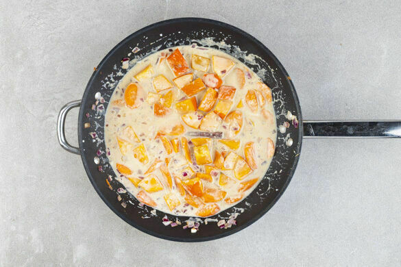 Die Zwiebeln und die 1/2 des Knoblauchs und des Ingwers in einer großen Pfanne mit 1EL Pflanzenöl, 1–2TL Garam Masala und 1/2TL Salz bei mittlerer Hitze 2–3Min. anbraten. Den Kürbis und die Karotten zugeben und 2Min. mitbraten. Die Kokosmilch, 1/2TL Zimt und 150–200ml Wasser hinzufügen und alles 12–15Min. bei mittlerer Hitze kochen, bis das Gemüse gar ist.