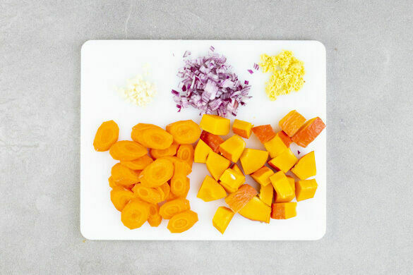 In einem mittelgroßen Topf 800ml leicht gesalzenes Wasser für den Reis zum Kochen bringen. Den Kürbis halbieren, die Kerne entfernen und das Fruchtfleisch grob würfeln. Die Karotten ggf. schälen und schräg in dünne Scheiben schneiden. Die Zwiebeln und den Knoblauch schälen und fein würfeln. Den Ingwer schälen und fein würfeln oder reiben.