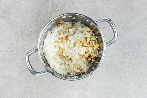 Die restlichen Cashews mit 1EL Pflanzenöl in einer kleinen Pfanne bei mittlerer Hitze ca. 2Min. braten, bis sie goldbraun sind, dann mit dem Öl in den Reis rühren. 1TL Zitronenschale und 1EL Zitronensaft dazugeben und umrühren.