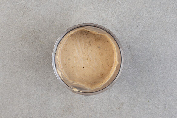 In einem mittelgroßen Topf ausreichend gesalzenes Wasser für die Pasta zum Kochen bringen. Den Knoblauch schälen und halbieren. Mit den Cashews, den Hefeflocken, dem Steinpilzpulver, der Sojasahne, 50ml Wasser, 1/2TL Salz und 1 kräftigen Prise Pfeffer in einem hohen Gefäß pürieren.