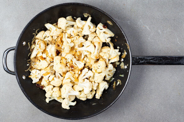 Den Blumenkohl und die Zwiebeln in der Pfanne mit 1EL Olivenöl bei mittlerer bis starker Hitze 2–3Min. Die Rosinen und den Knoblauch zugeben, mit 100ml Wasser ablöschen und alles weitere 2–3Min. garen, bis der Blumenkohl bissfest und die Flüssigkeit verdampft ist. Mit Salz und Pfeffer abschmecken, mit der Wurst, den Kartoffeln und dem Dip anrichten und servieren.