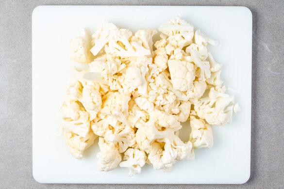 Den Blumenkohl in 2–3cm große Stücke schneiden, den Strunk entfernen.