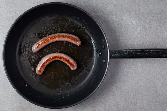Die Würste in einer mittelgroßen Pfanne mit 1–2TL Olivenöl bei mittlerer Hitze auf jeder Seite 2–3Min. anbraten. Währen der letzten 4–5Min. der Backzeit zu den Kartoffeln auf das Blech geben und im Ofen fertig garen.