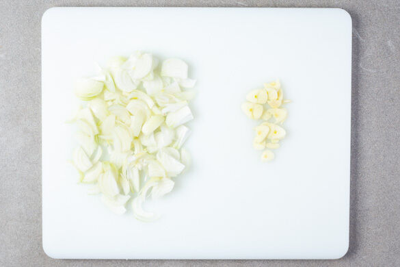 Die Zwiebel schälen, halbieren und in feine Streifen schneiden. Den Knoblauch schälen und in dünne Scheibchen schneiden.