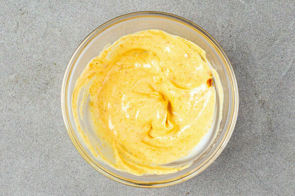 4EL Mayonnaise mit 1TL Currypaste verrühren. Tipp: Wer mag, kann auch mehr Currypaste verwenden.