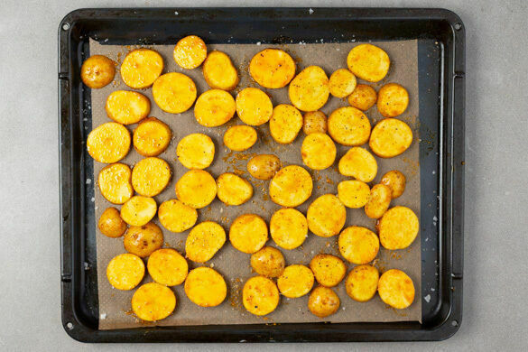 Den Backofen auf 240°C (220°C Umluft) vorheizen. Die Kartoffeln samt Schale in ca. 1cm dicke Scheiben schneiden. Auf einem mit Backpapier ausgelegten Backblech mit 1–2TL Currypaste und 2TL Olivenöl vermengen, gleichmäßig verteilen und ca. 20Min. im heißen Ofen rösten, bis die Kartoffeln gar sind. Vor dem Servieren mit 3–4 Prisen Salz würzen.