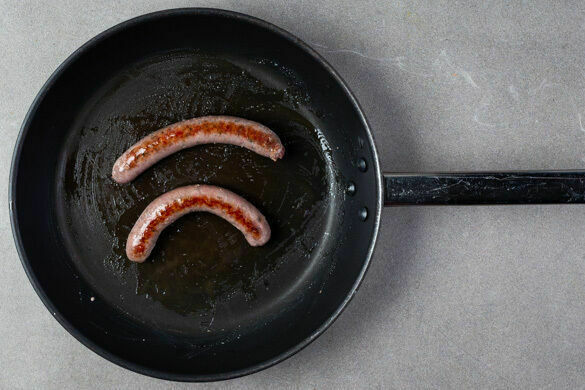 Die Würste in einer großen Pfanne mit 1EL Olivenöl bei mittlerer Hitze auf jeder Seite 2–3Min. anbraten. Währen der letzten 4–5Min. der Backzeit zu den Kartoffeln auf das Blech geben und im Ofen fertig garen.