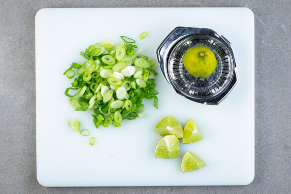 In einem zweiten mittelgroßen Topf ausreichend Wasser für die Nudeln zum Kochen bringen. Die Lauchzwiebel schräg in dünne Ringe schneiden. Die Limette halbieren, eine Hälfte auspressen, die andere Hälfte in Spalten schneiden.
