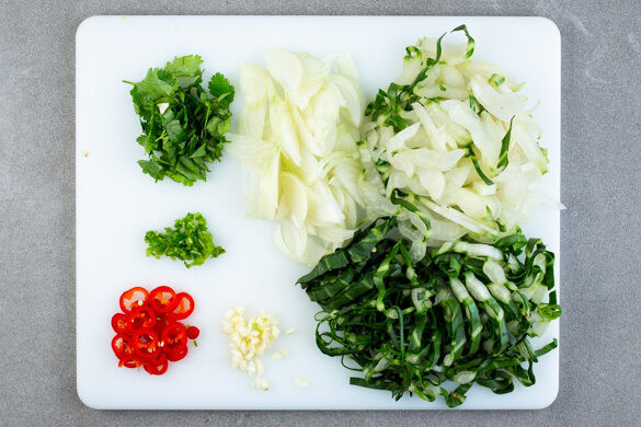 Den weißen und grünen Teil des Pak Choi getrennt in dünne Streifen schneiden. Die Zwiebel schälen, halbieren und in feine Streifen schneiden. Den Knoblauch schälen und fein würfeln. Die Korianderblätter abzupfen und grob schneiden, die Korianderstiele fein hacken. Die Peperoni in feine Ringe schneiden, ggf. für weniger Schärfe entkernen oder weniger verwenden.