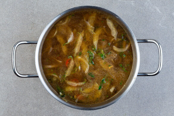 Die Zwiebeln und die weißen Pak-Choi-Streifen in einem mittelgroßen Topf mit 1EL Pflanzenöl und der Gewürzmischung bei starker Hitze kurz anrösten, bis es aromatisch duftet. Mit 1L warmem Wasser ablöschen und das Brühgewürz, den Knoblauch, die Korianderstiele, die Sojasauce und die Peperoni unterrühren. Die Suppe bei mittlerer Hitze köcheln lassen.