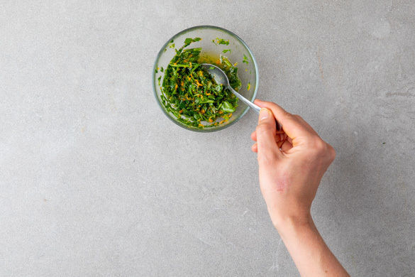 Für das Dressing die Kräuter mit 1TL Orangenabrieb, 1–2EL Orangensaft, 1EL Olivenöl und 2–3EL Essig mischen. Mit Salz und Pfeffer abschmecken, nach Geschmack mehr Orangenabrieb dazugeben.