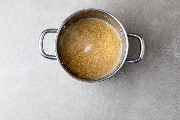 In einem kleinen Topf 450ml leicht gesalzenes Wasser zum Kochen bringen. Die Quinoa in einem feinmaschigen Sieb mit warmem Wasser abspülen, in das kochende Wasser geben und 10–12Min. abgedeckt bei niedriger bis mittlerer Hitze sanft köcheln lassen. Vom Herd nehmen und bis zum Servieren warm halten.