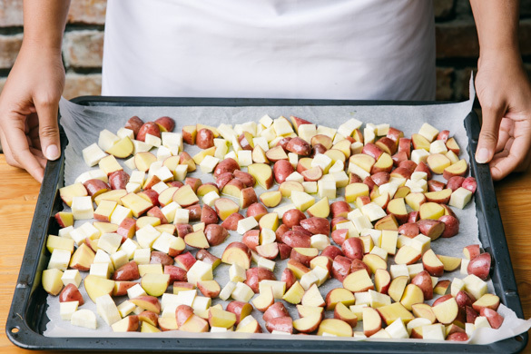 Den Backofen auf 220°C (200°C Umluft) vorheizen. Die Kartoffeln samt Schale in 1–2cm große Würfel schneiden. Die Pastinake schälen und in etwas kleinere Würfel schneiden. Die Paprika halbieren, entkernen und in dünne Streifen schneiden. Die Zwiebel schälen, halbieren und in feine Streifen schneiden.
