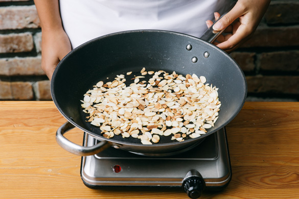Die Mandeln in einer großen Pfanne ohne Zugabe von Fett bei niedriger bis mittlerer Hitze 1–2Min. goldbraun anrösten. Vorsicht, sie können schnell zu dunkel werden. Zum Abkühlen auf einem Teller beiseitestellen.