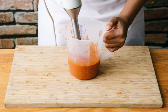 Die Paprika und die Zwiebeln in derselben Pfanne mit 1EL Olivenöl bei mittlerer Hitze 5–8Min. braten. Die Hitze reduzieren und mit dem geräucherten Paprikapulver nach Geschmack sowie Salz und Pfeffer würzen. Das Gemüse mit den passierten Tomaten und 1–2EL Wasser ablöschen und ca. 10Min. sanft köcheln lassen.
